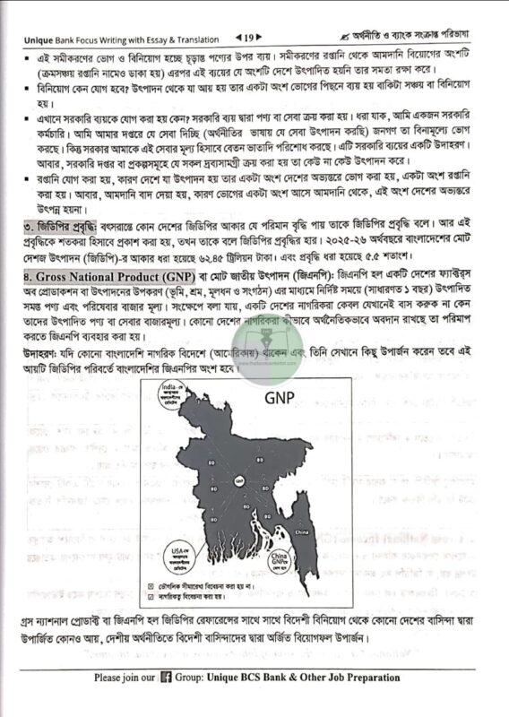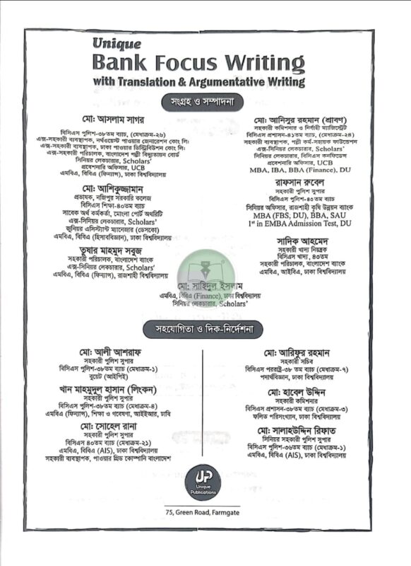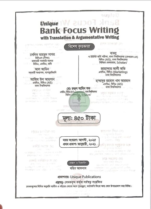 বাংলাদেশ ব্যাংক, সরকারি-বেসরকারি ব্যাংক, বিসিএস ও স্বায়ত্তশাসিত প্রতিষ্ঠান (রাষ্ট্রায়াত্ত বিভিন্ন গ্যাস ও বিদ্যুৎ কোম্পানী) সহ সকল প্রতিযোগিতামূলক চাকুরি পরীক্ষার জন্য সহায়ক “Unique Bank Focus Writing with Translation & Argumentative writing “বইটির নবম সংস্করণ প্রকাশ করতে পেরে মহান সৃষ্টিকর্তার নিকট কৃতজ্ঞতা জ্ঞাপন করছে ইউনিক টিম। বর্তমানে যে কোনো ধরনের চাকুরি পরীক্ষা অত্যন্ত প্রতিযোগিতামূলক হচ্ছে। এর মূল কারণ হচ্ছে স্বল্প সংখ্যক আসন এর বিপরীতে বিপুল সংখ্যাক পরীক্ষার্থীর পরীক্ষায় অংশগ্রহণ। সুতরাং প্রতিযোগিতামূলক এই পরীক্ষায় কাঙ্খিত ফলাফল অর্জনে আমাদেরকে হতে হবে স্ট্রাটেজিক এবং পড়াশুনা করতে হবে সিস্টেমেটিক্যালি। এই সকল পরীক্ষায় সাফল্য পেতে হলে লিখিত পরীক্ষায় ভালো করা অপরিহার্য কারণ প্রিলির মার্কস মোট নম্বরের সাথে যোগ হয় না এবং ভাইভার মার্কস ও অনেক কম থাকে। এক্ষেত্রে লিখিত পরীক্ষায় ভালো মার্কস একজন পরীক্ষার্থীকে তার স্বপ্নপুরণে সর্বাত্মক সাহায্য করে। আর লিখিত পরীক্ষায় একটি ভালো মার্কস পেতে হলে কিছু বিষয়ের দিকে অবশ্যই খেয়াল রাখতে হবেঃ- ১. তথ্য-উপাত্ত ২. চিত্রগত উপস্থাপনা ৩. কোটেশন ৪. বিভিন্ন বিষয়ভিত্তিক লেখার নিয়ম। আপনাদের প্রিয় “Unique Bank Focus Writing” বইটি বরাবরের মতই প্রয়োজনীয় তথ্য ভান্ডার, চিত্রগত উপস্থাপনা ও অন্যান্য বিষয়গুলো অত্যন্ত পরিমার্জিতরূপে সাজানো হয়েছে।
